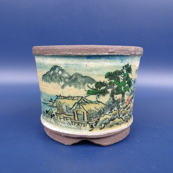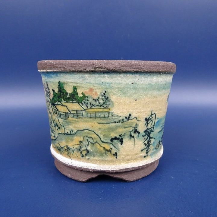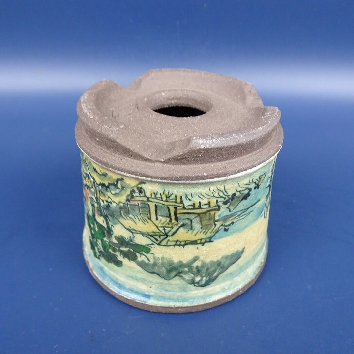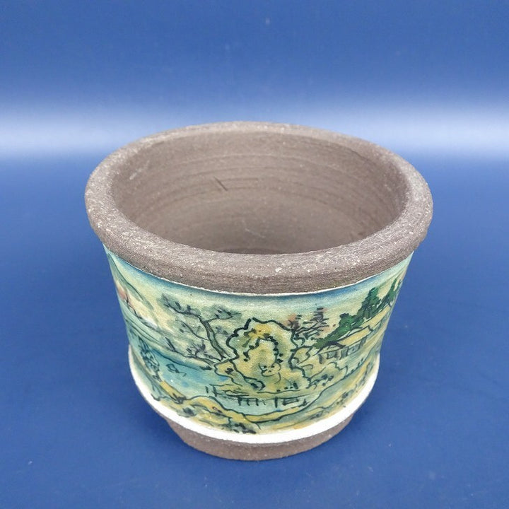 中古盆栽鉢 陶翠 小鉢 長辺 約7.4cm 丸鉢 外縁 色絵 山水図 中古鉢 r1198410257