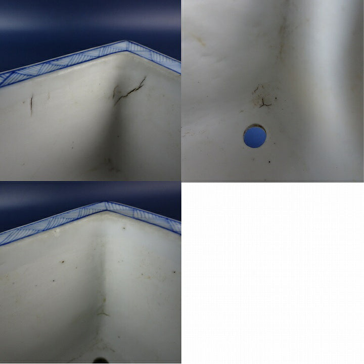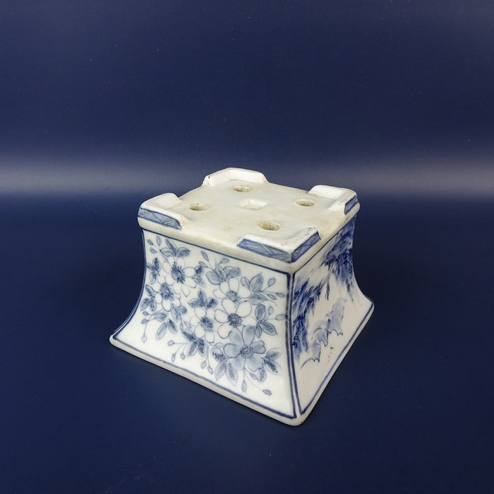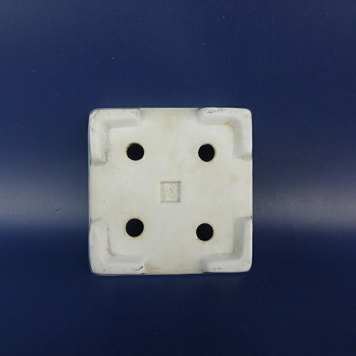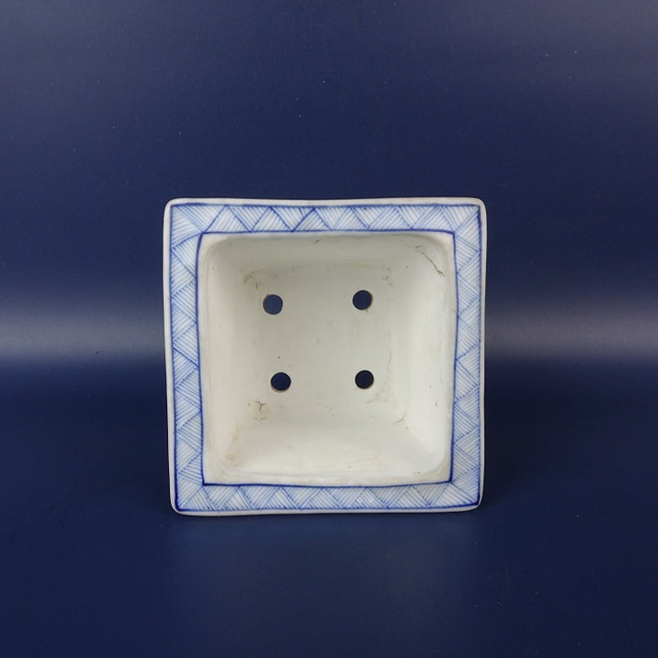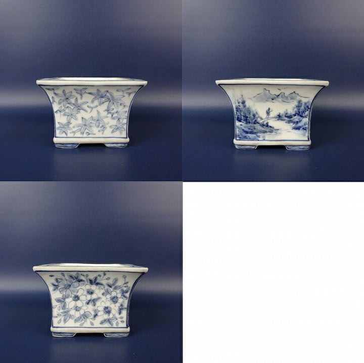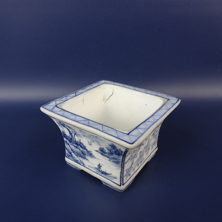 中古盆栽鉢 雪山? 小鉢 長辺 約 9.3cm 正方鉢 染付 風景 人物 花 模様 中国鉢 鑑賞 観賞用 中古鉢 p1199283576