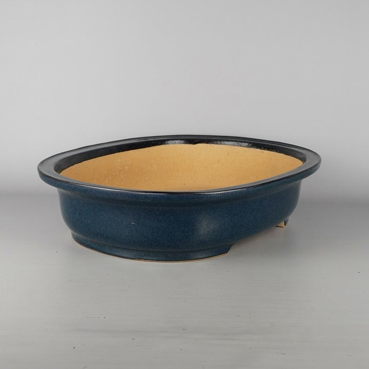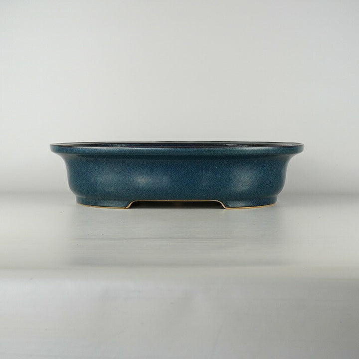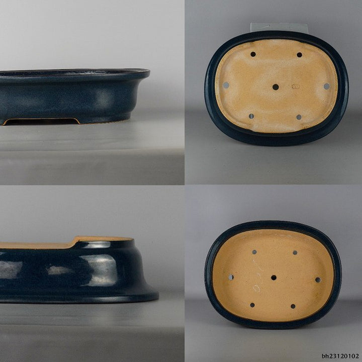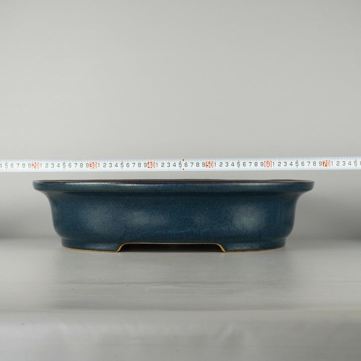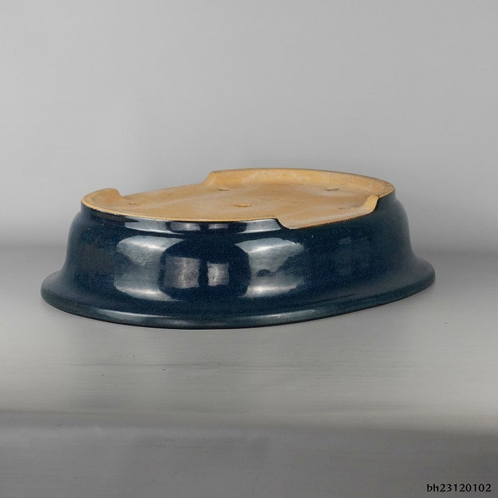 盆栽鉢 常滑 黎鳳造 大型 長辺 約48cm 楕円鉢 外縁 釉薬 現品 中古鉢 本名 片岡勝資 常滑では焼締陶が主体で釉色主体として制作する人が少ない中、主として釉色樹鉢や釉色水盤をつくる。中国古渡り、中渡りの白交趾、均釉再現に努め若くして定評を得る。 現在は常滑のみならず日本を代表する釉色盆器の作り手の一人である。 近年は南蛮風の焼締陶を手掛け、部分...