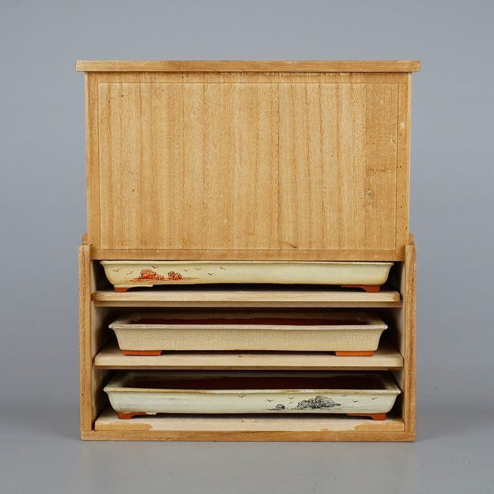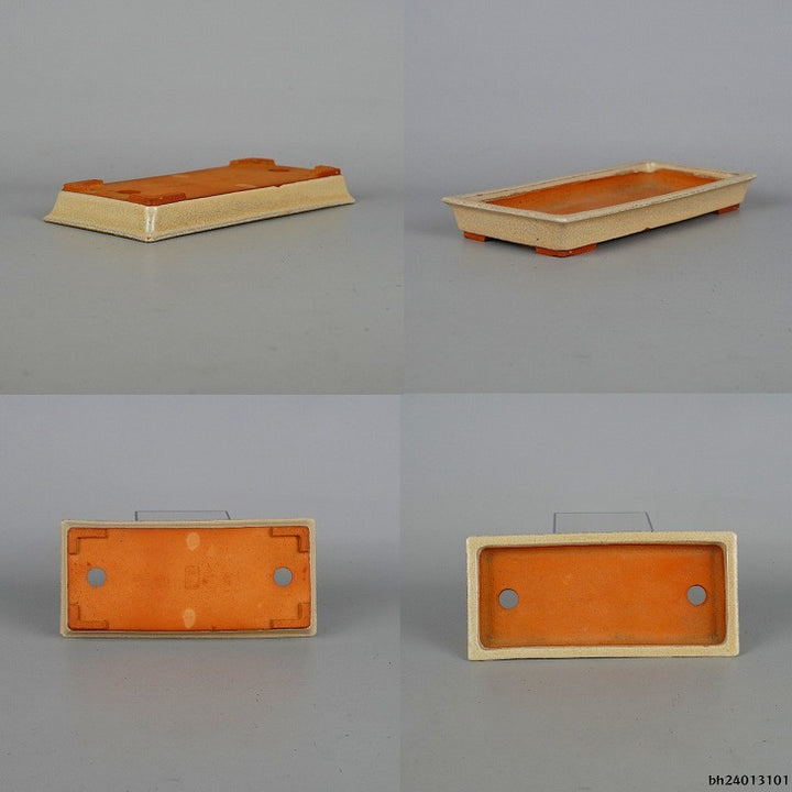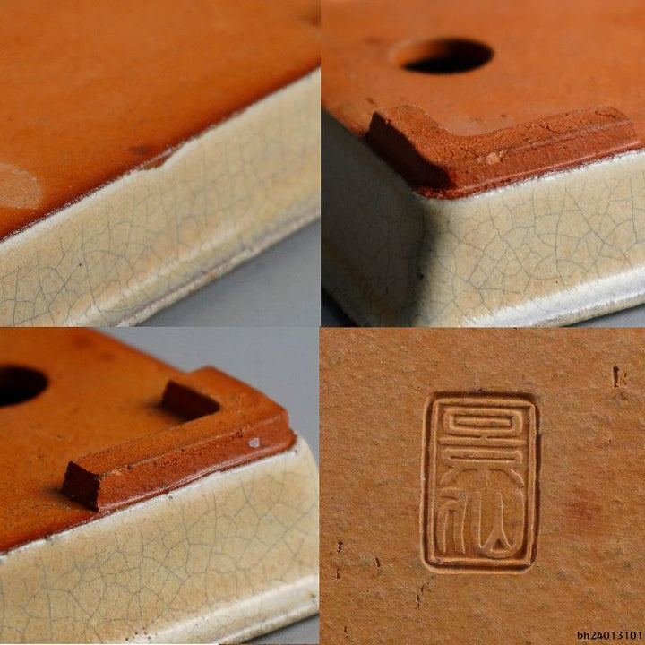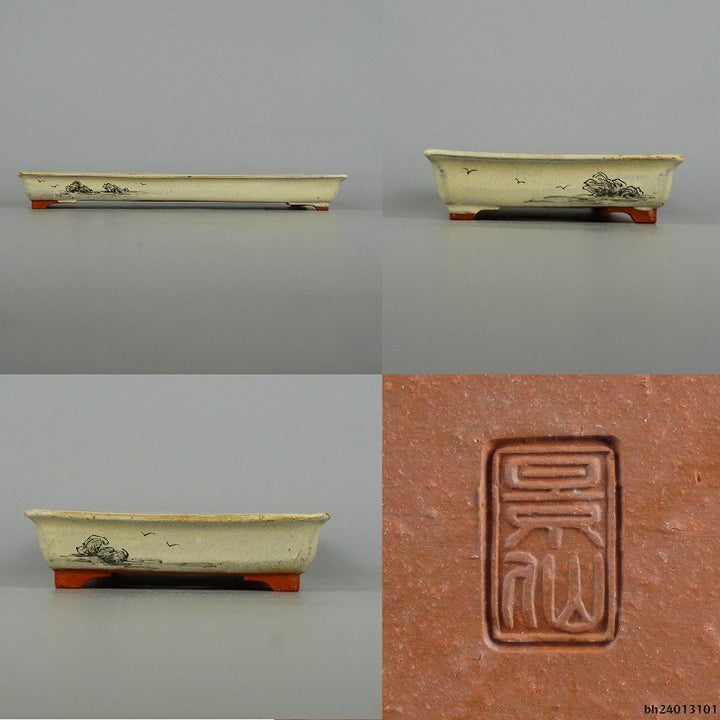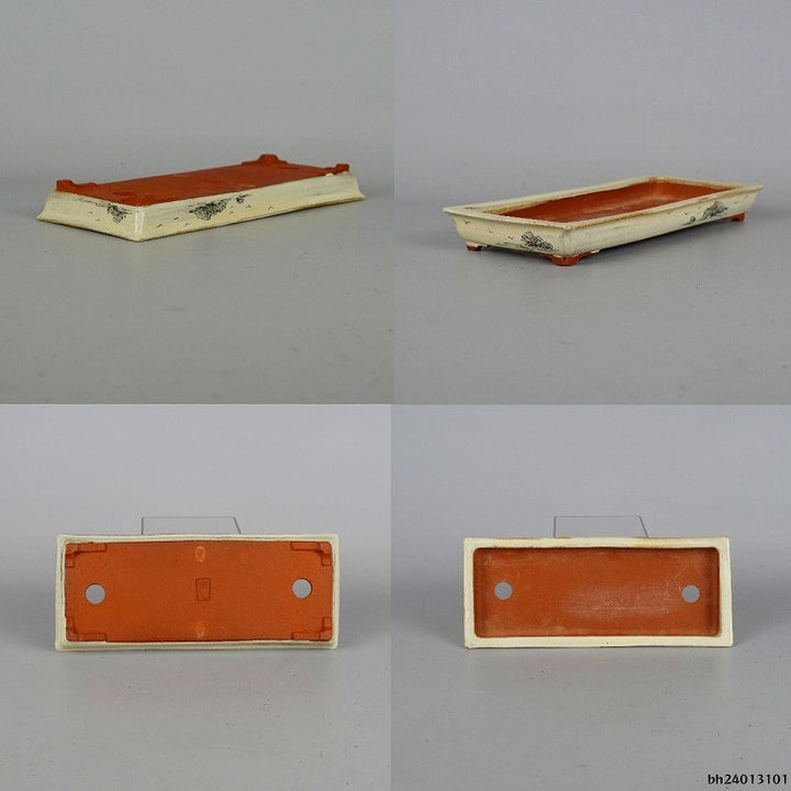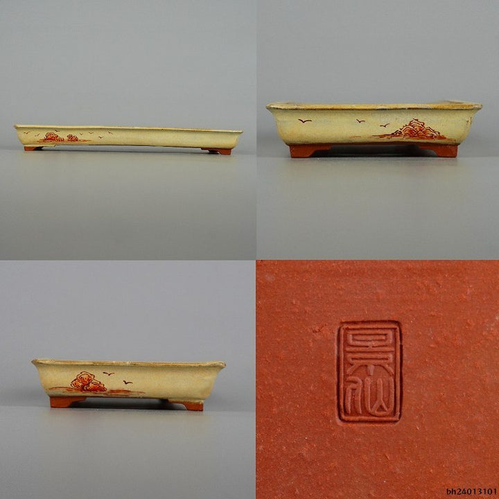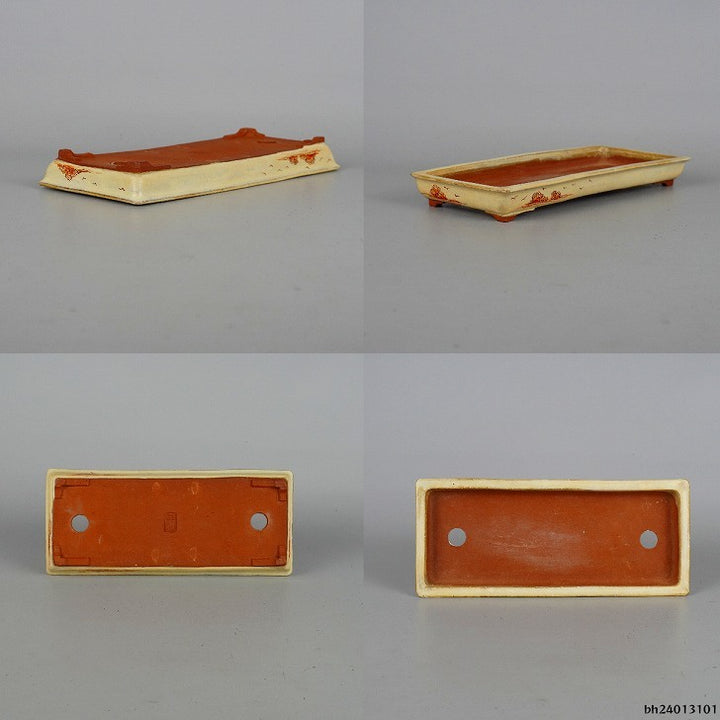 盆栽鉢 景仙 3点セット 中型 長辺 約21.5cm 長方鉢 赤絵 釉薬 絵鉢 現品 中古鉢 高さ 約2.3センチ 横幅 約21.3センチ 奥行 約9センチ...