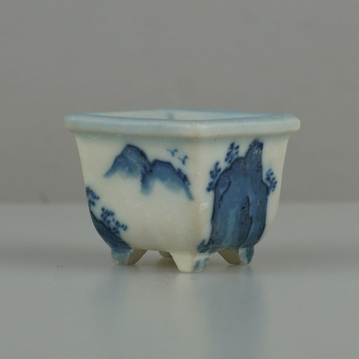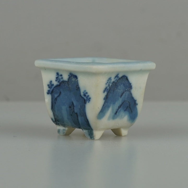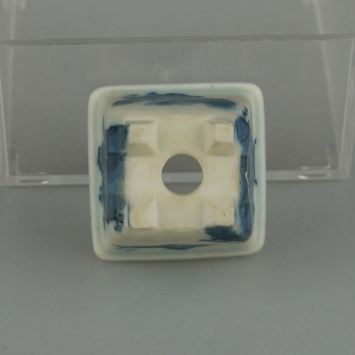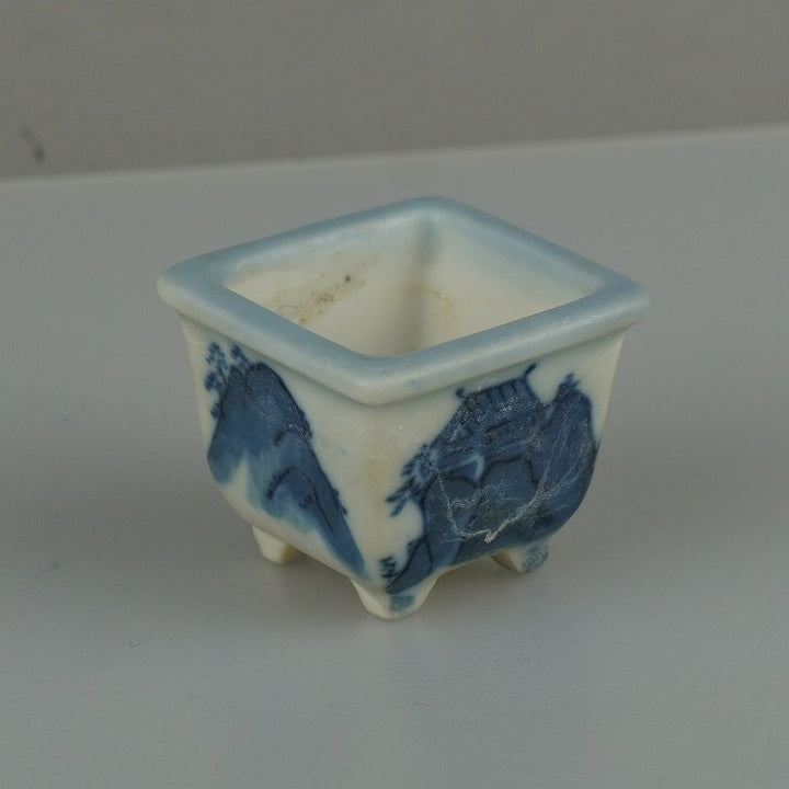 盆栽鉢 落款なし 豆鉢 長辺 約 3.8cm 正方鉢 外縁 山水図 ミニ鉢 観賞用 現品 中古鉢 品名落款なし...