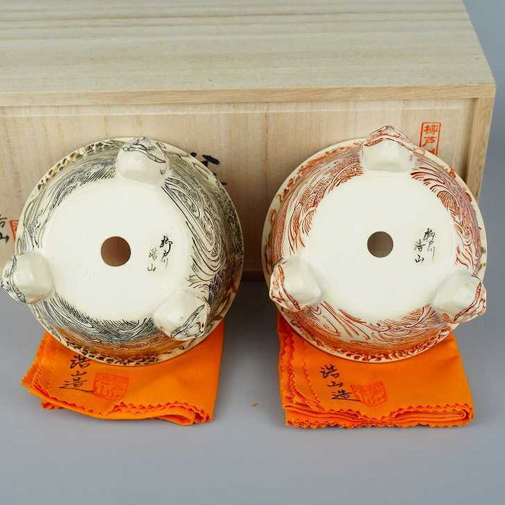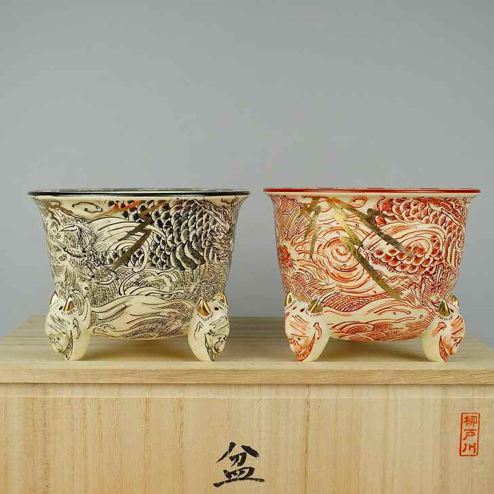 柳戸川 浩山 共布 共箱 外縁 丸鉢 黒絵 赤絵 龍画 観賞用 盆栽鉢 新品 g1198418132