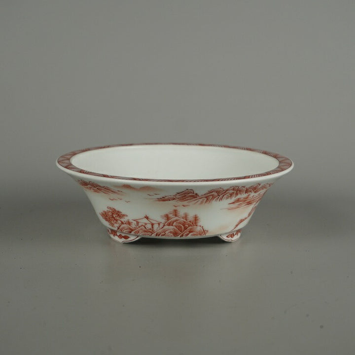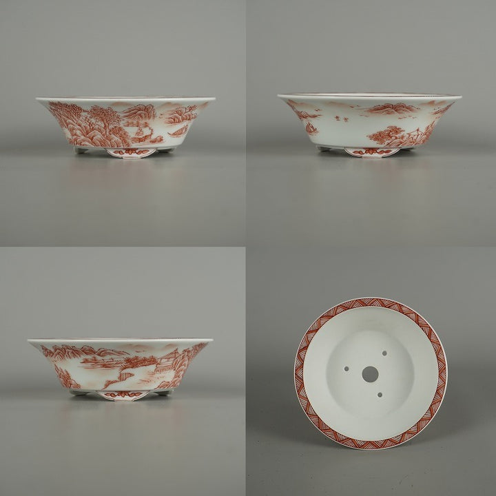 盆栽鉢 は二わ オリジナル鉢 小型 長辺 約 15.5cm 丸鉢 赤絵 山水図 花 模様 箱 布付 鑑賞 観賞用 新品 1203118823