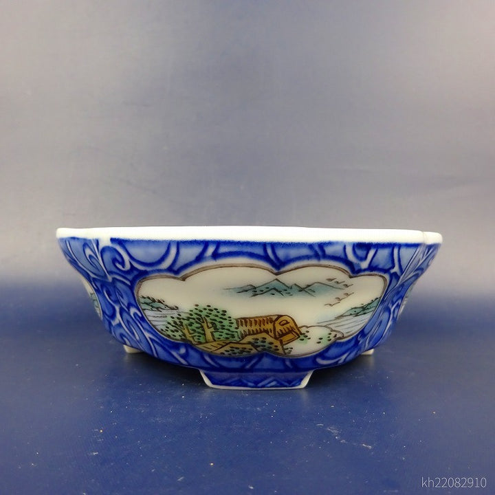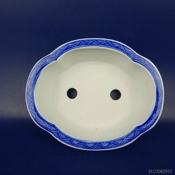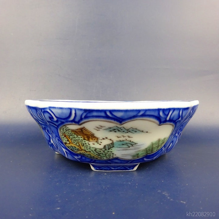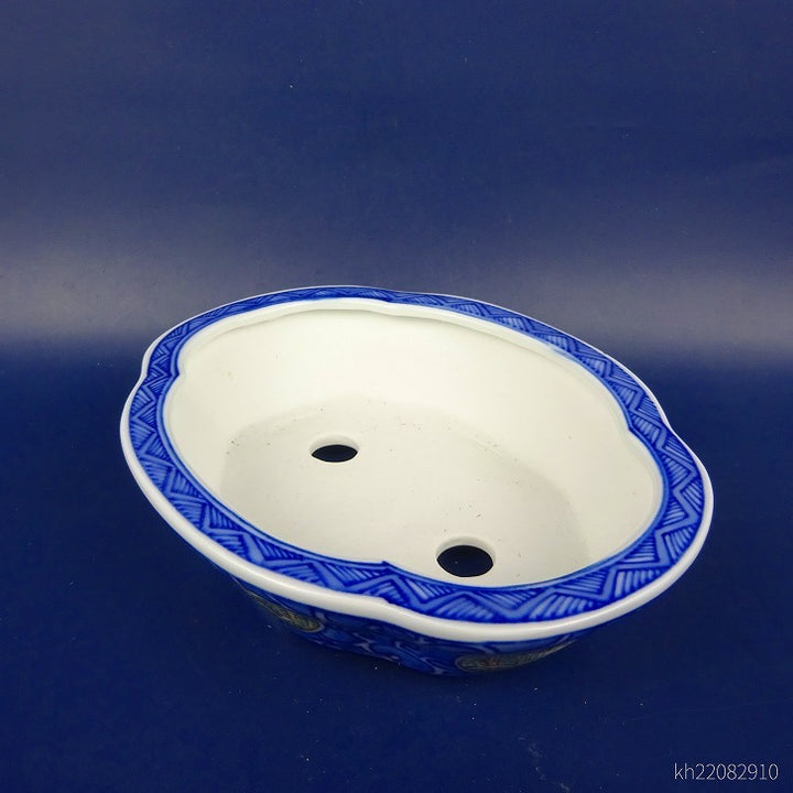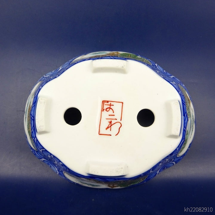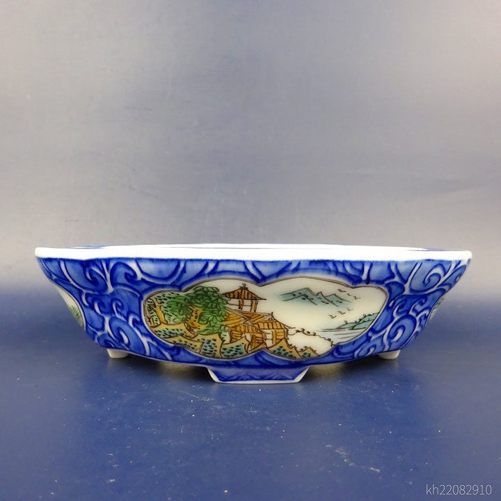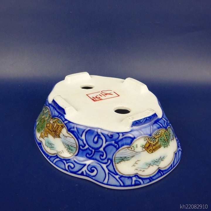 盆栽鉢 は二わ オリジナル鉢 小型 長辺 約15.2cm 木瓜鉢 色絵 窓抜 山水図 風景画 新品 m1198405891