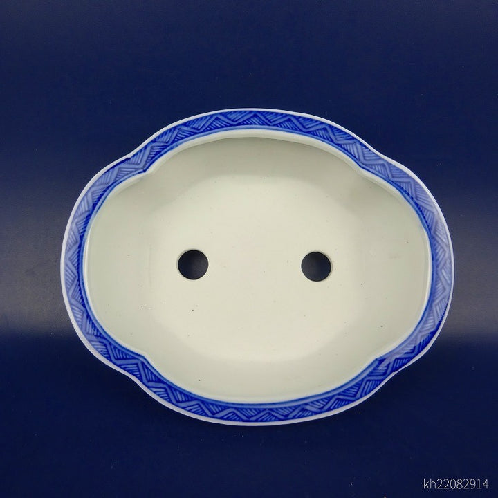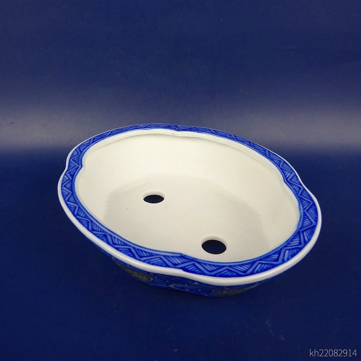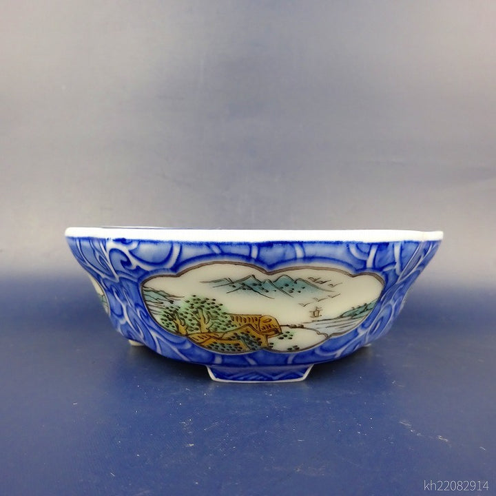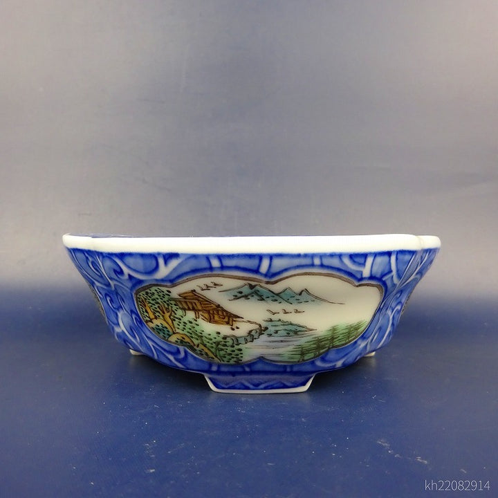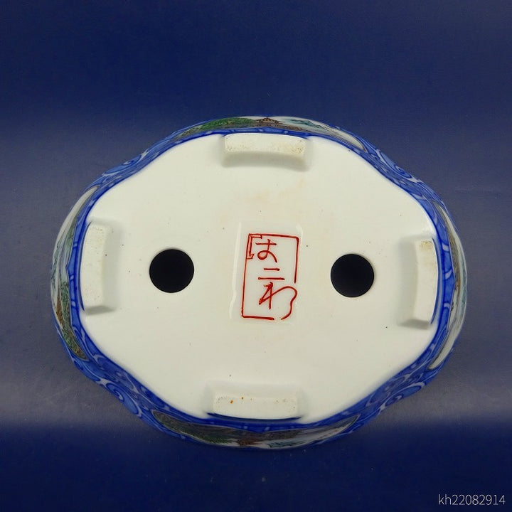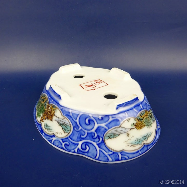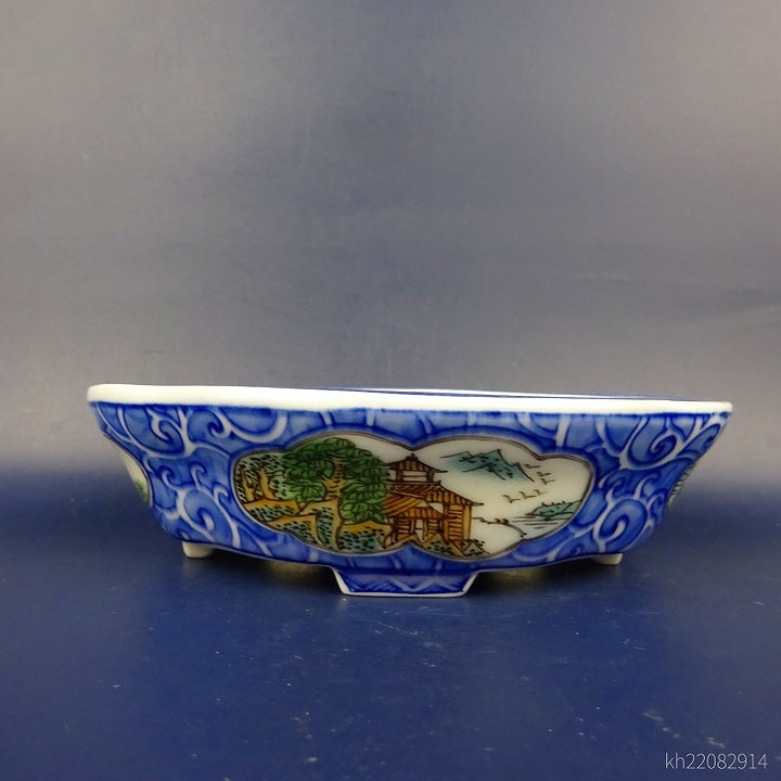 盆栽鉢 は二わ オリジナル鉢 小型 長辺 約15.3cm 木瓜鉢 色絵 窓抜 山水図 風景画 新品 m1198408027