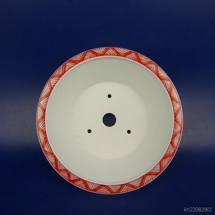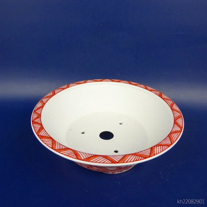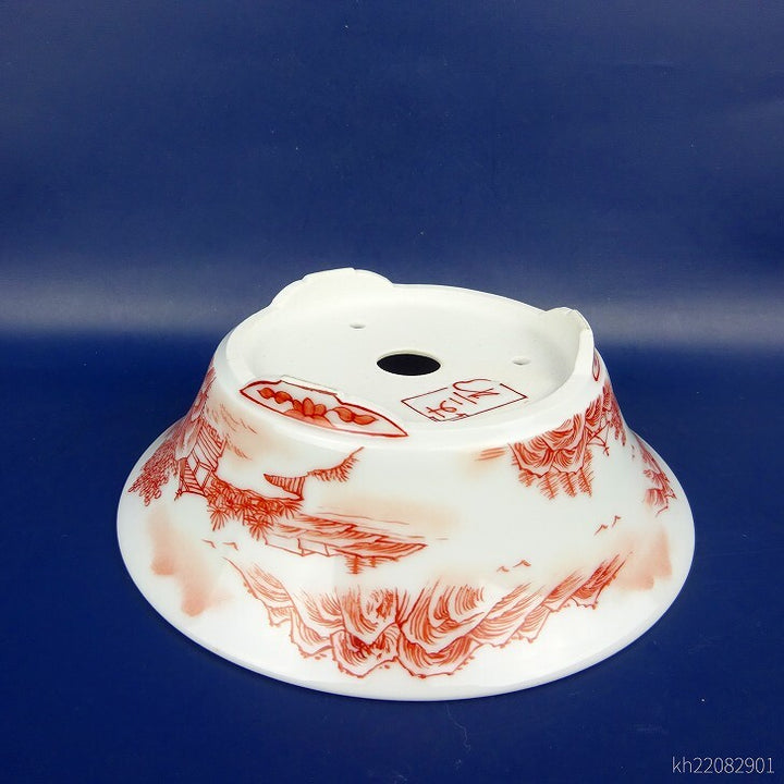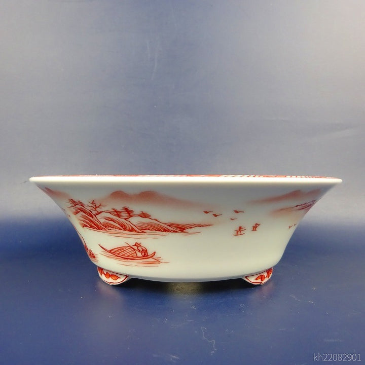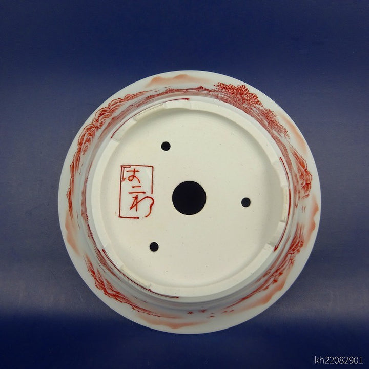 盆栽鉢 は二わ オリジナル鉢 小型 長辺 約15.5cm 丸鉢 赤絵 山水図 風景画 新品 o1198426166
