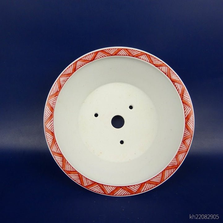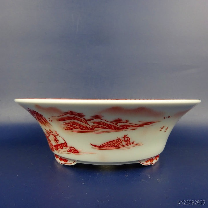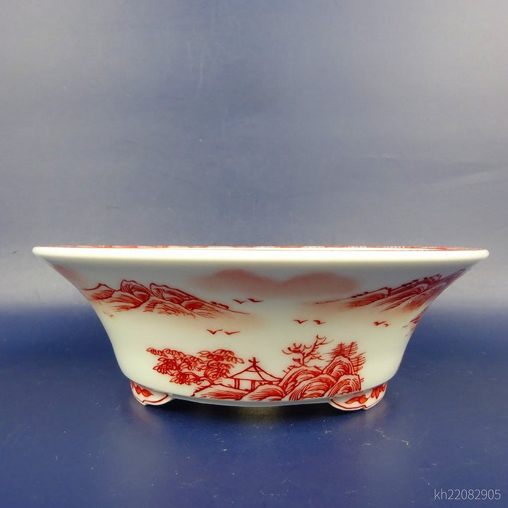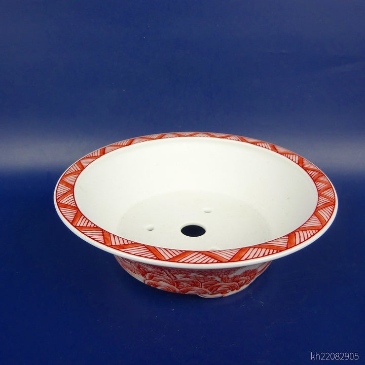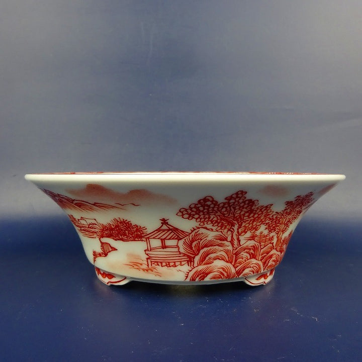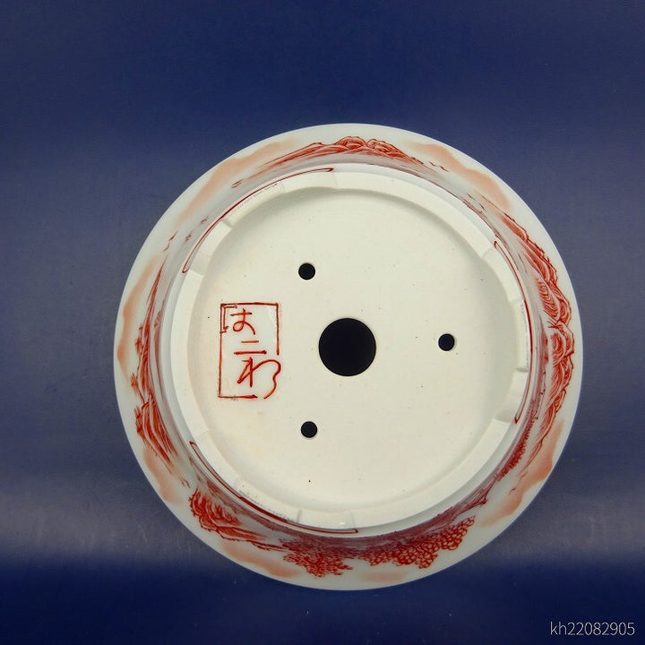 盆栽鉢 は二わ オリジナル鉢 小型 長辺 約15.5cm 丸鉢 赤絵 山水図 風景画 新品 v1198436934