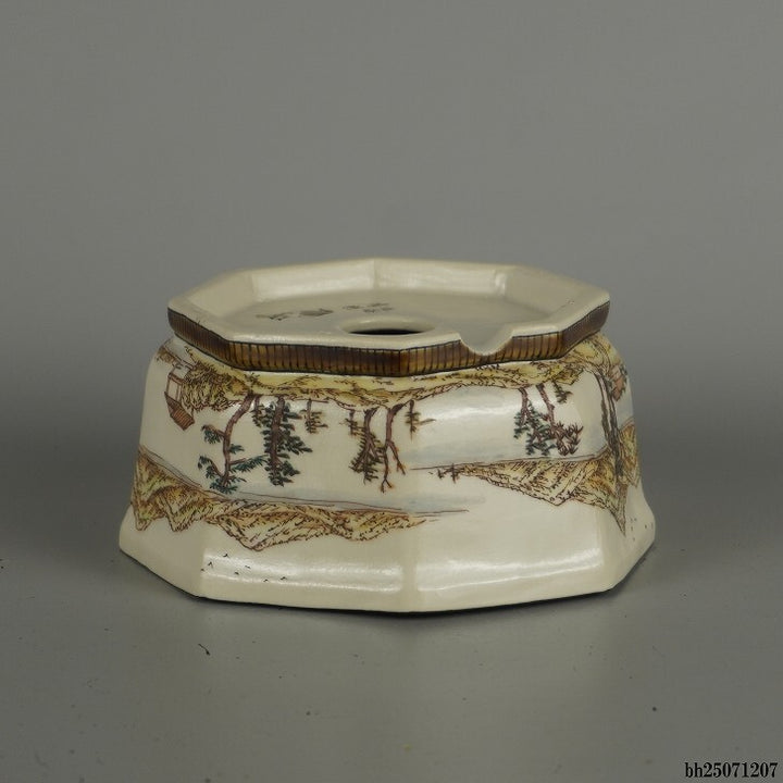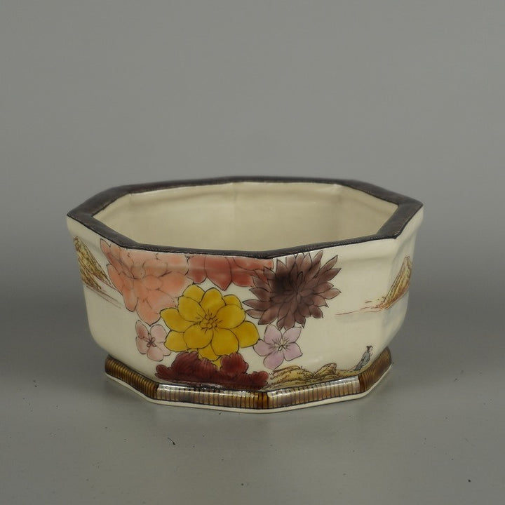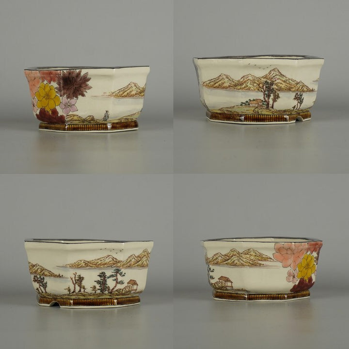 盆栽鉢 九谷 有朋 小型 長辺 約 13cm 八角鉢 色絵 山水図 花 共箱 共布 鑑賞 観賞用 新品 c1202101152