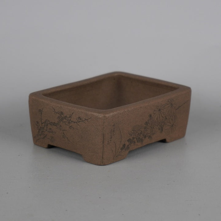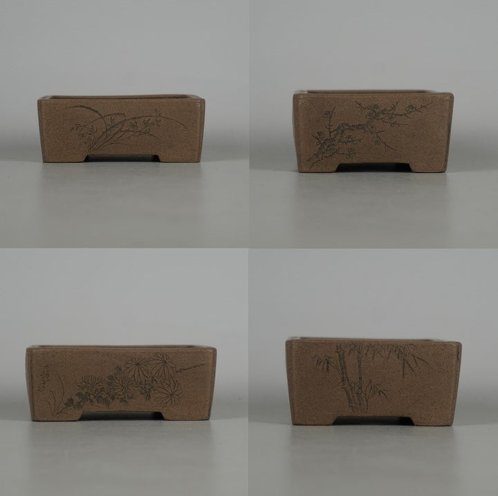 盆栽鉢 壺堂 小型 長辺 約10.3cm 長方鉢 彫入 四君子 共箱 共布 観賞用 新品 k1198413414