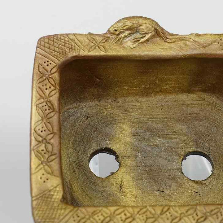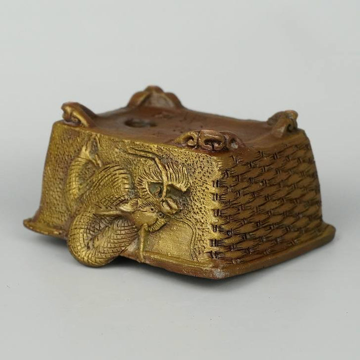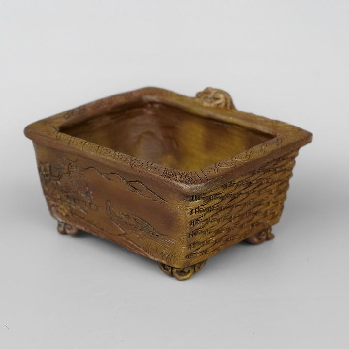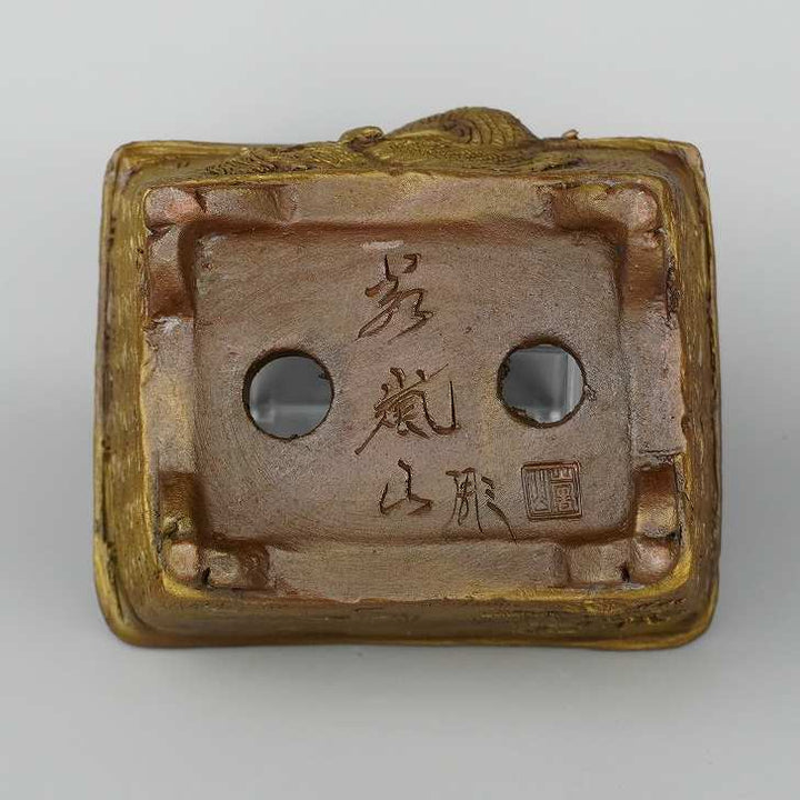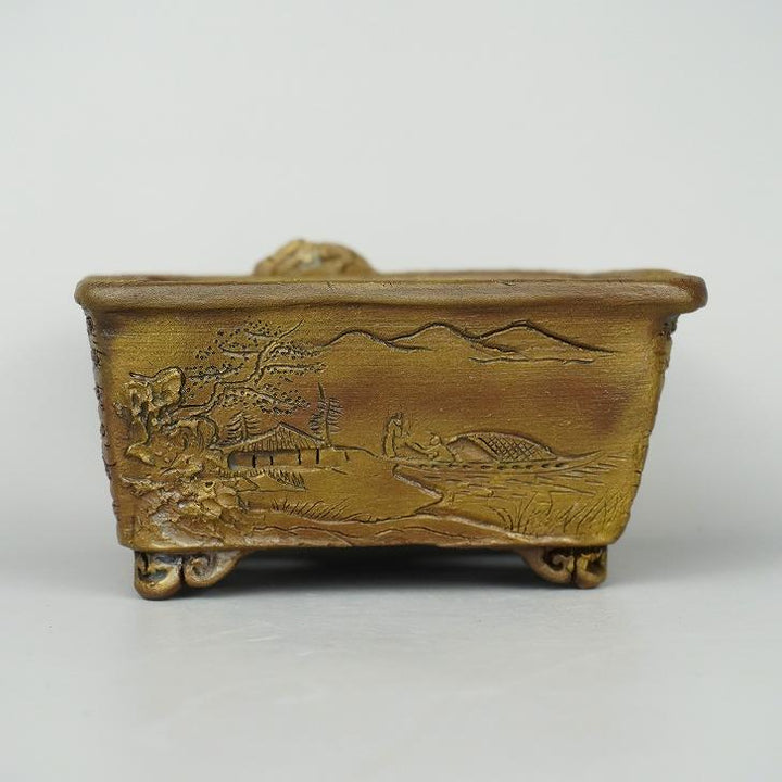 盆栽鉢 嵐山 谷嵐山 小型 長辺 約11cm 長方鉢 雲足 浮彫 龍 鼠図 彫入 山水図 外縁 籠目 観賞用 新品 g1198419020