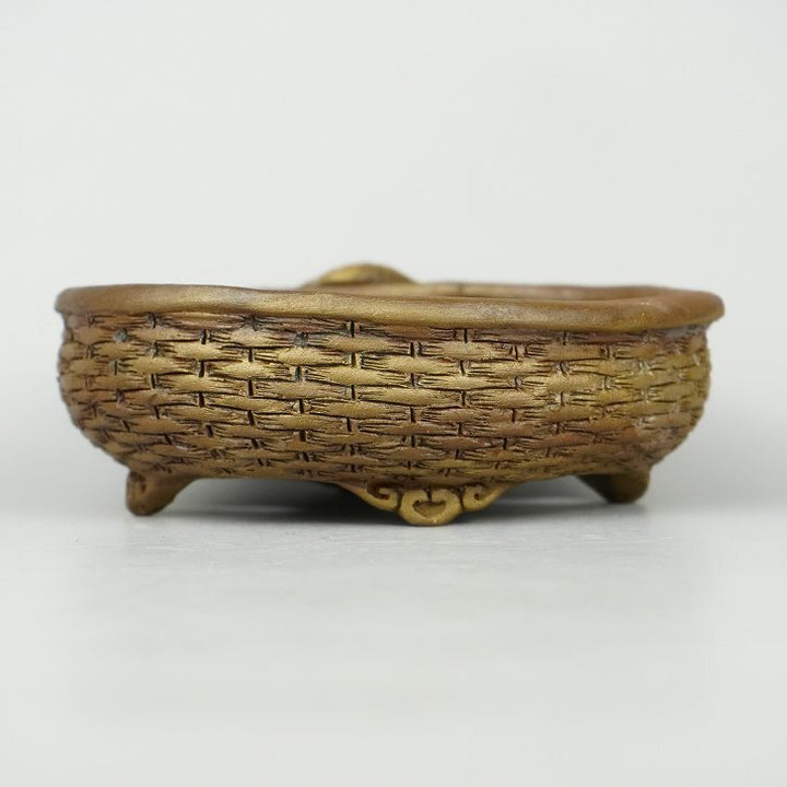 盆栽鉢 嵐山 谷嵐山 小型 長辺 約13cm 楕円鉢 雲足 浮彫 龍図 籠目 竜 リュウ 観賞用 現品 新品 谷 嵐山 本名 谷 弘之 趣味の盆栽が高じて小鉢制作を手掛け、昭和54年に仲間6人で共同窯を築窯し、六楽窯と名付ける。陶号は六楽窯の方が通っているかもしれない。60年に全国アマチュア小鉢作家展で会長賞、第2回BONSAIの器展で特別奨励賞、第1回現代小鉢作家展で奨励賞を受賞する。 多忙のため寡作だったが、郷里へ帰って以降は活発に作陶活動を...