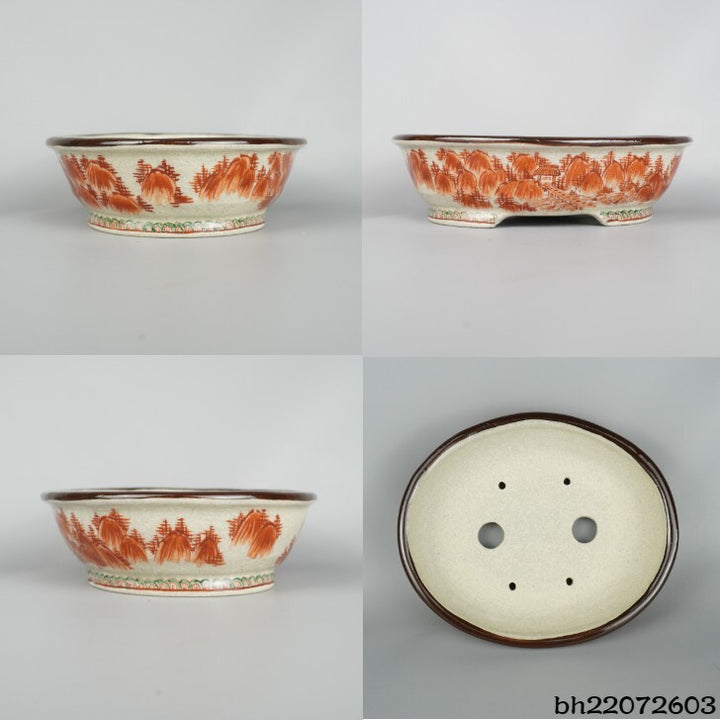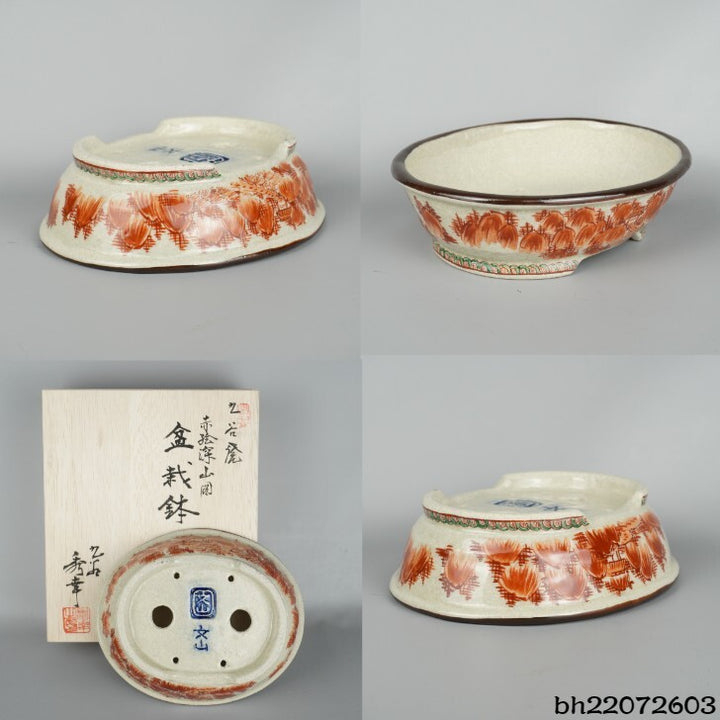 盆栽鉢 文山 越前文山 ボデー 九谷画 九谷 秀幸 中型 長辺 約20cm 楕円鉢 赤絵 深山図 観賞用 新品 x1198413719