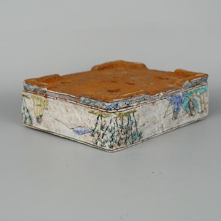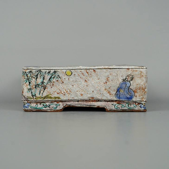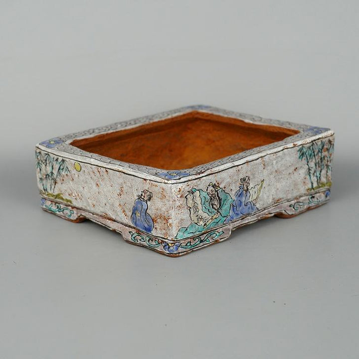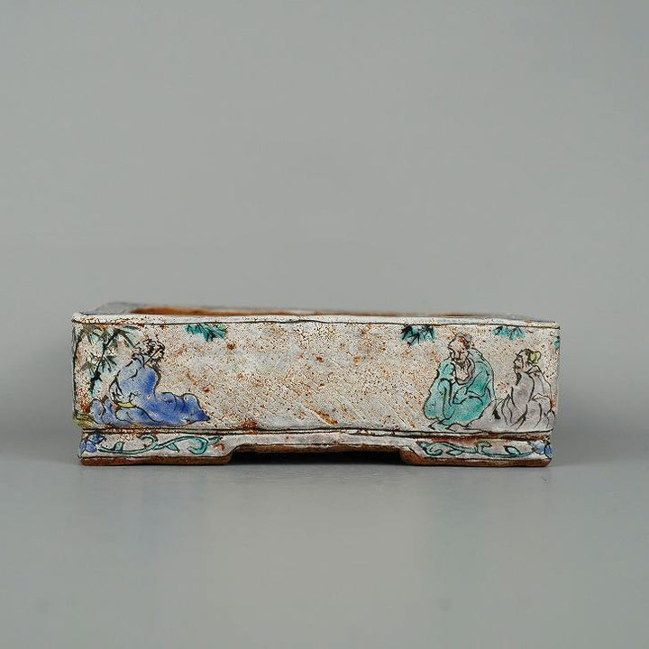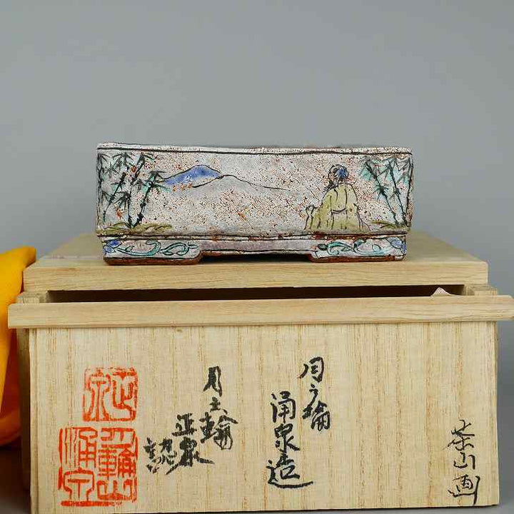 盆栽鉢 月之輪 涌泉造 茶山画 小型 長辺 約13cm 長方鉢 色絵 賢人 山水画 共布 共箱 観賞用 現品 新品 品 名月ノ輪涌泉造 茶山画(共布・共箱) サイズ高さ 約4センチ...