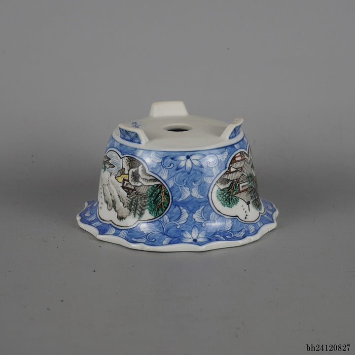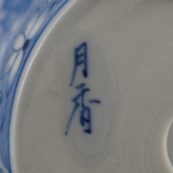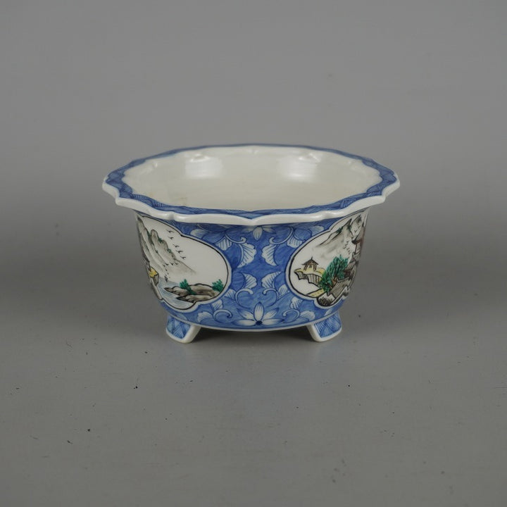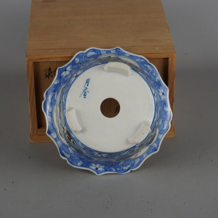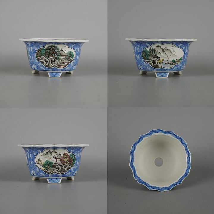盆栽鉢 月香 小型 長辺 約12.2cm 丸鉢 染付 窓抜 五彩 山水図 共箱 観賞用 新品 1198410152
