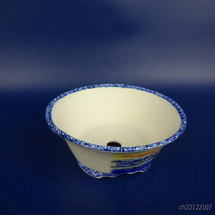 盆栽鉢 紀伊 小型 長辺 約10.5cm 丸鉢 外縁 色絵 山水図 東海道 五拾三次ノ内 保士ヶ谷 風景画 新品 s1198419302
