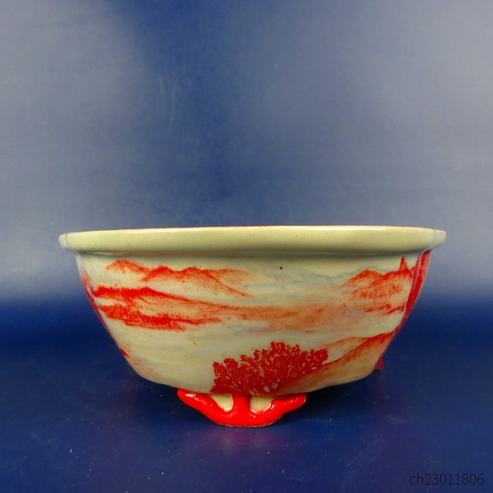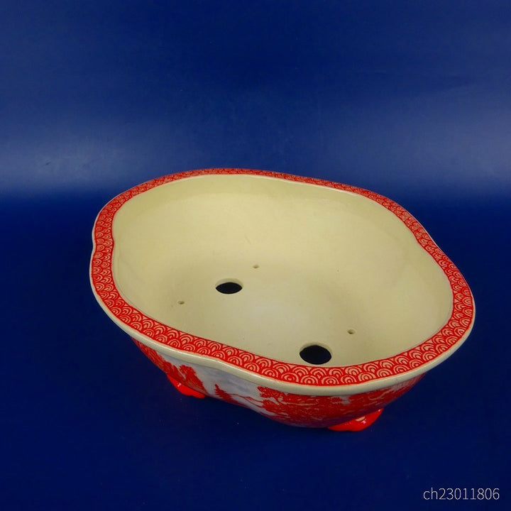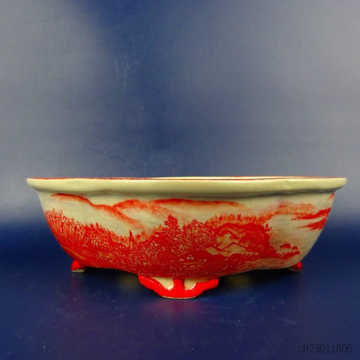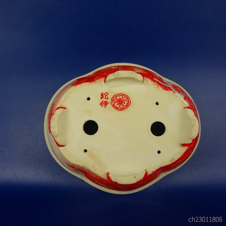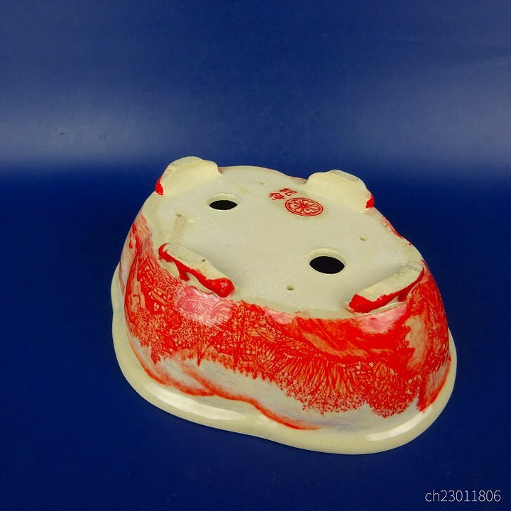 盆栽鉢 紀伊 小型 長辺 約16.7cm 木瓜鉢 外縁 赤絵 風景画 山水図 新品 v1198437277