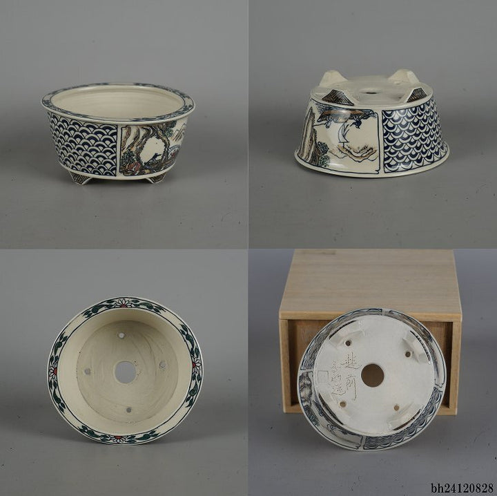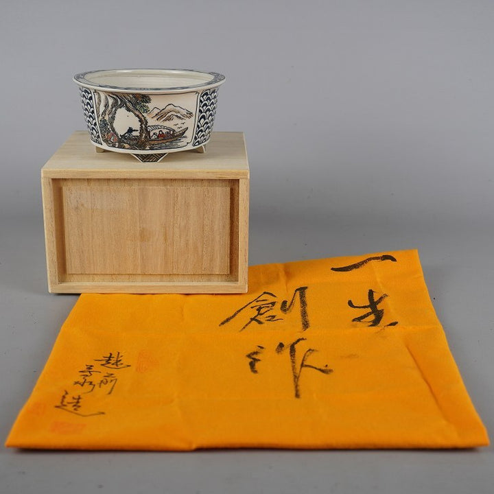 盆栽鉢 越前 芳水 小型 長辺 約11.7cm 丸鉢 五彩 赤壁 舟遊画 共箱 共布 観賞用 現品 新品 品名越前芳水(共箱・共布)...