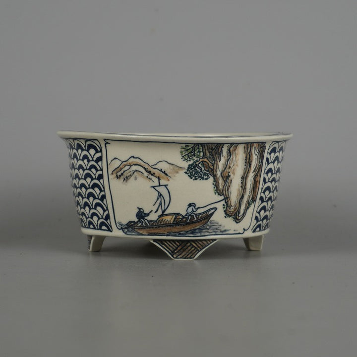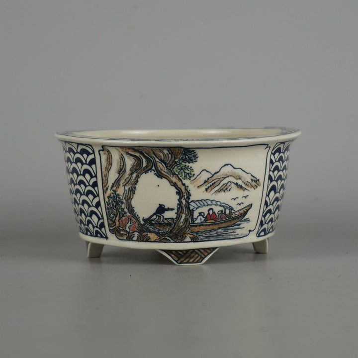 盆栽鉢 越前 芳水 小型 長辺 約11.7cm 丸鉢 五彩 赤壁 舟遊画 波文 共箱 共布 観賞用 新品 x1198411985