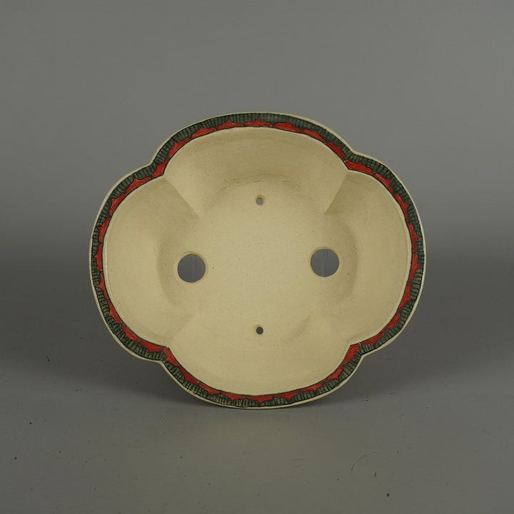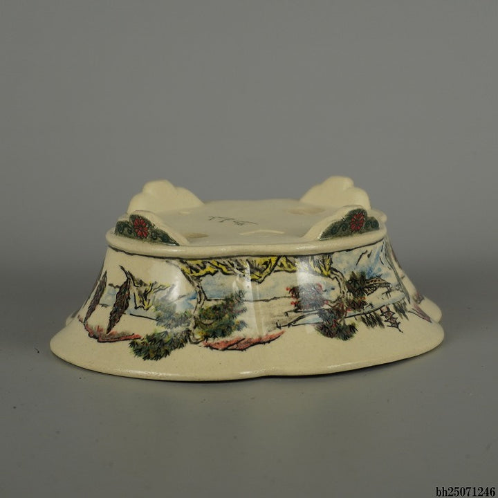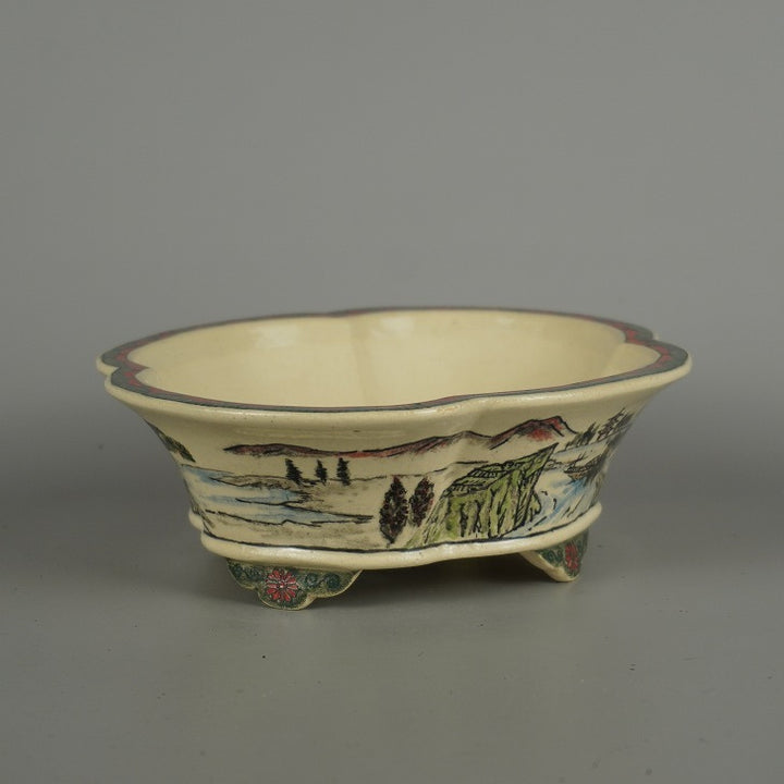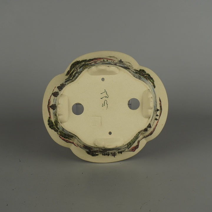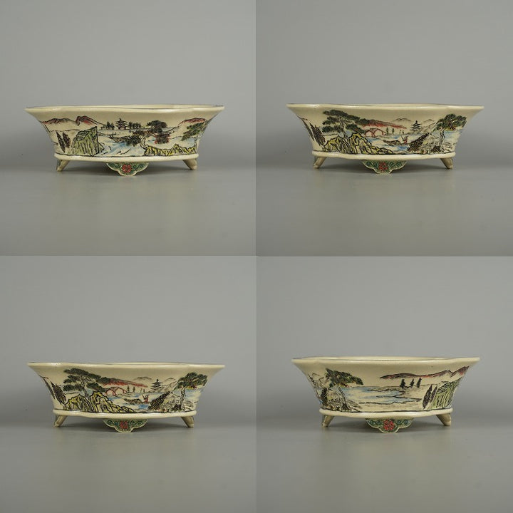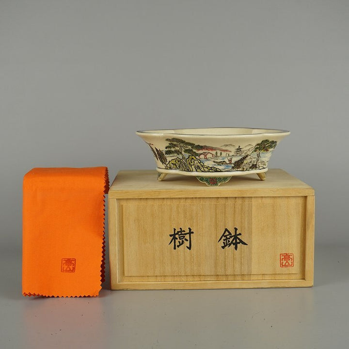 盆栽鉢 高山 小型 長辺 約 18cm 木瓜鉢 色絵 山水図 模様 共箱 共布 鑑賞 観賞用 新品 g1203142804