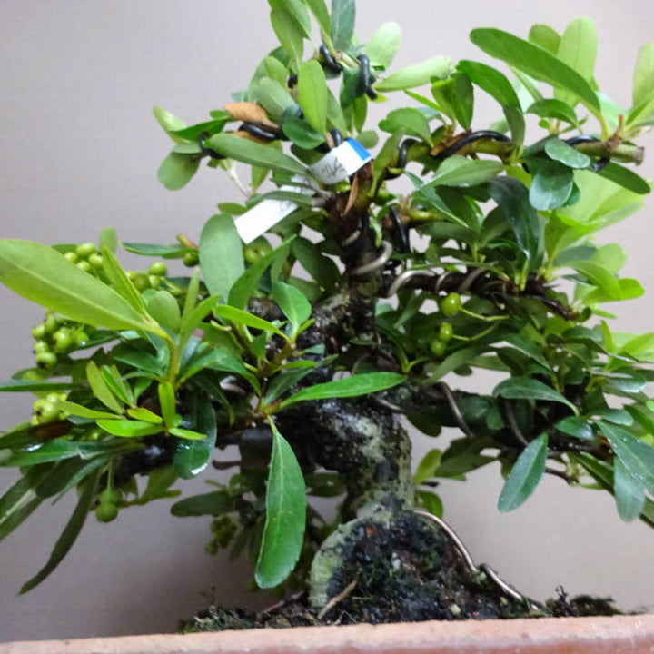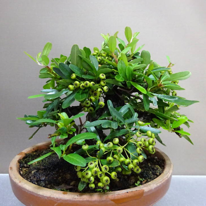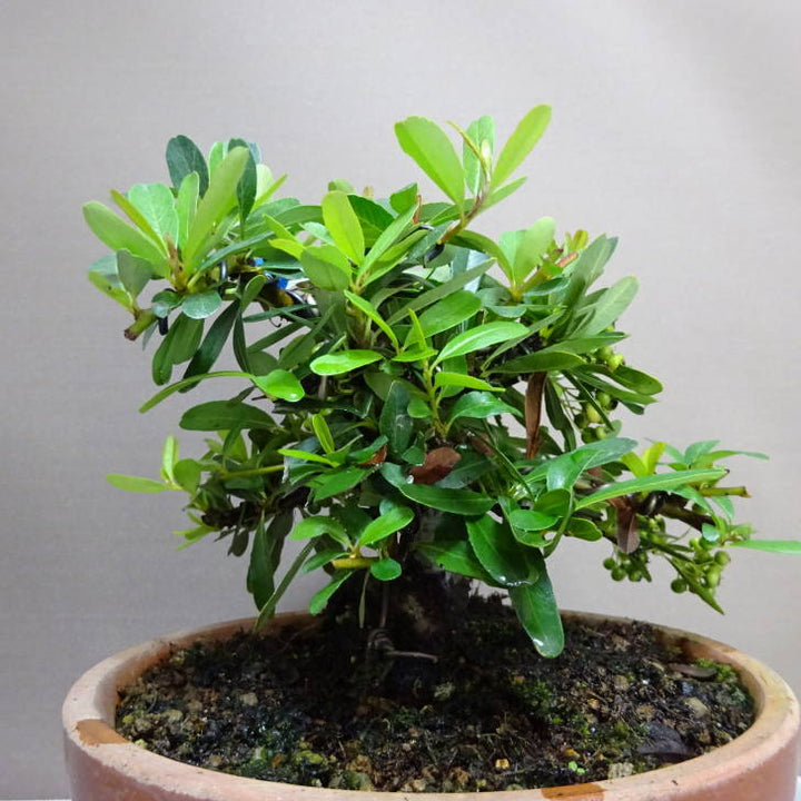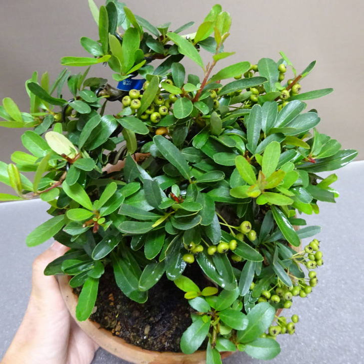 盆栽 ピラカンサ 樹高 約 16cm Pyracantha バラ科 常緑樹 観賞用 小品 現品 ■植物ですので撮影時期や季節によって剪定などの手入れにより写真から変化がございます。撮影日をご確認のうえ、ご注文ください。 【ピラカンサ盆栽】 開花時期は5月~6月頃、小さな5弁の白い花を咲かせます。果実はやや潰れたような球形でをしており、秋頃に色づきます。 ピラカンサにはいくつか種類があり、赤い実や黄色の実、濃い緑色の葉、白やピンクの斑が入るものも...