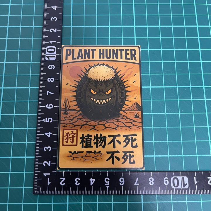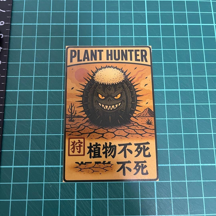 PLANT HUNTER LAB オリジナルステッカーシリーズ。 アタカマ砂漠を生き抜く伝説のサボテン「黒王丸」。 その中でも特に希少な白刺変種「albispina(白刺黒王丸)」をモチーフにした一枚です。 頂部に白い刺冠をまとい、荒野を睨みつける姿は 「二度死なぬ生命力=植物不死 不死」を象徴。 PLANT HUNTERの理念をより強く打ち出したデザインになっています。 砂色の背景と赤い太陽が映える重厚な構図で、...