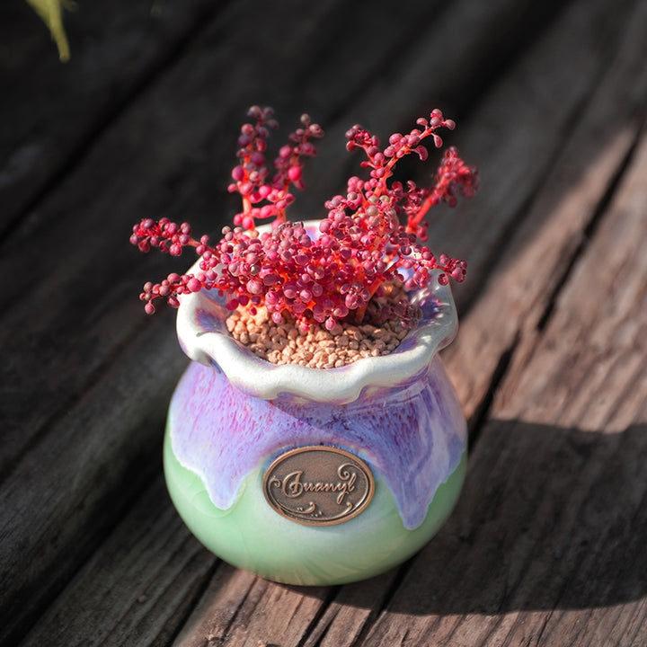 露镜是蕁麻科冷水花屬的迷你品种,以其圆润饱满的微型叶片著称。叶片呈亮绿色,在适当光照和温差下会泛出粉红色晕染,茎干纤细呈匍匐生长习性。植株高度通常不超过10cm,适合作为微景观或吊篮栽培。